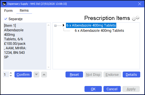 - Select the appropriate prescription and select Dispense. The Dispensary screen displays.