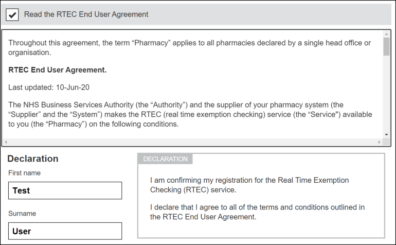 The RTEC End User Agreement displays. Use the scroll bar to navigate through the agreement and review the declaration text. Enter your name in the fields provided.