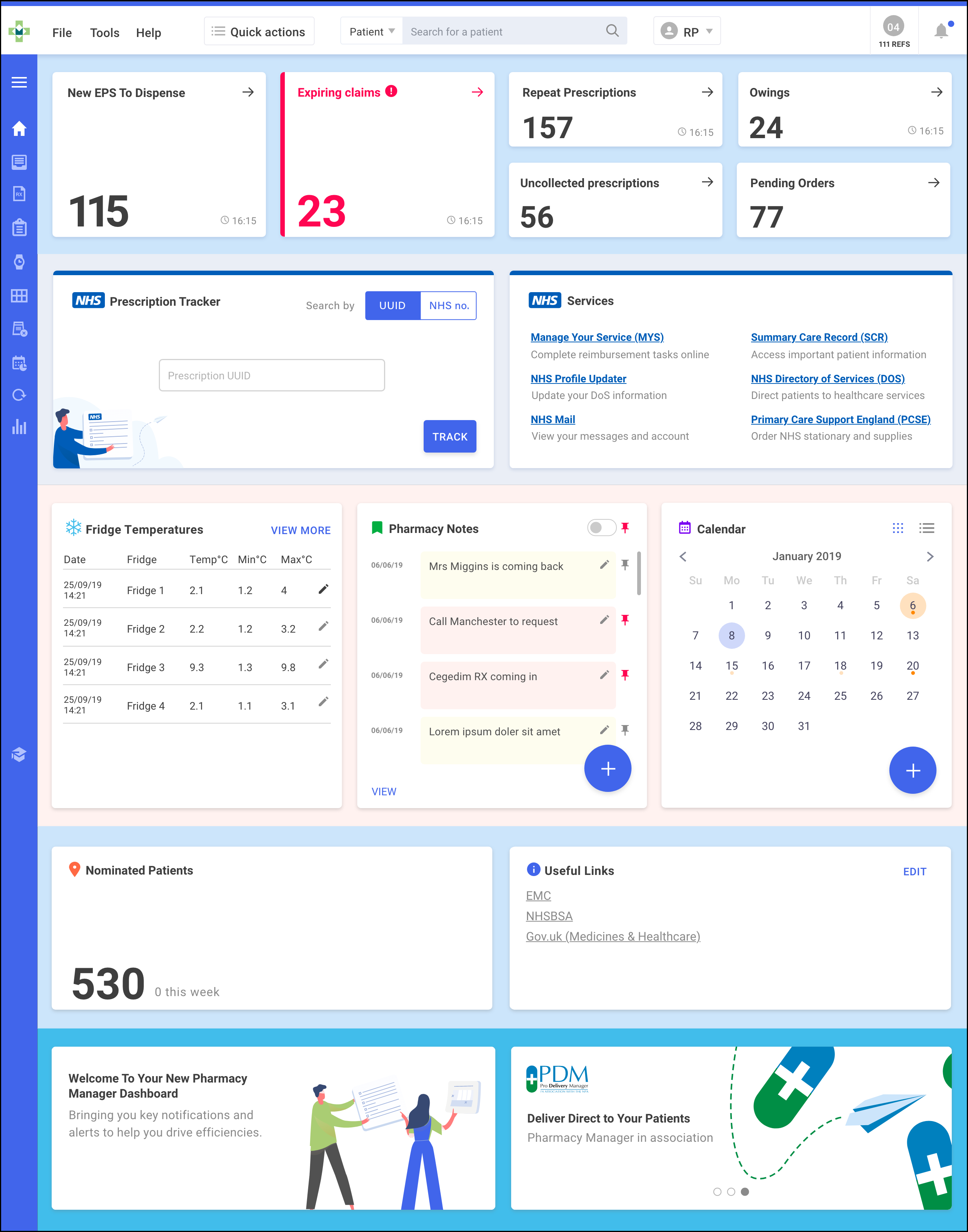 When you log into Pharmacy Manager, the Pharmacy Manager Intelligent Dashboard displays:
