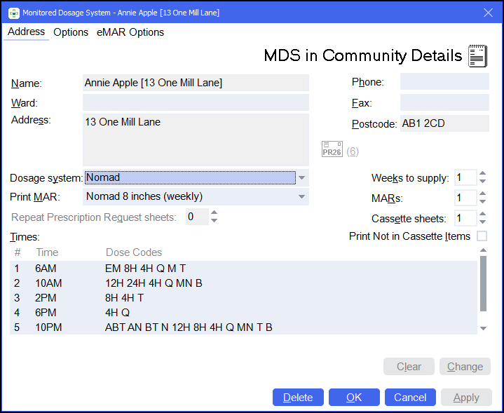 - Dosage system - Choose the MDS stationery to be printed and how the dosage times display on the MAR chart or Cassette sheet: