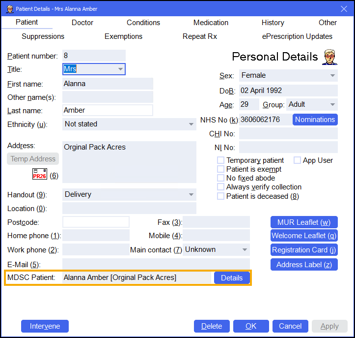 On the MDS screen, select MDS Details to view the Patient Details - Patient screen, note the patient's name displays in MDSC Patient: