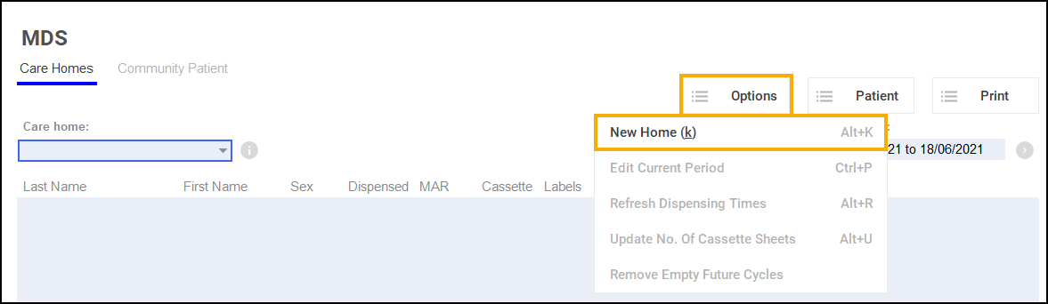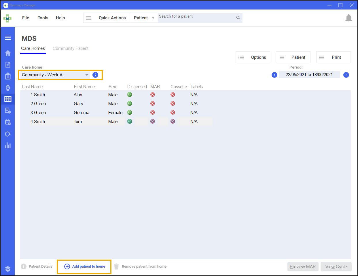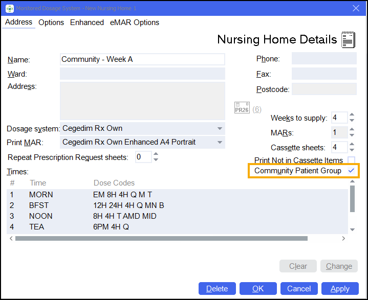 Community Patient Grouping allows the select patients to be grouped together whilst still retaining their own address. Each Community Patient Group allows the organisation of a singular cycle period and the ability to bulk print MAR and Cassette sheets as required.