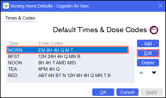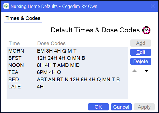 To amend global dose codes that are used across the system, from the Default Times & Dose Codes screen: