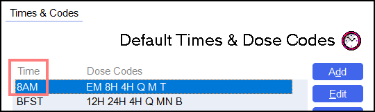 To amend global administration times that are used across the system, from the Default Times & Dose Codes screen:
