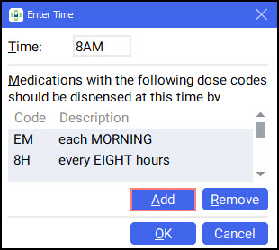 To add a dose code to an local administration time slot, used at a home by home basis: