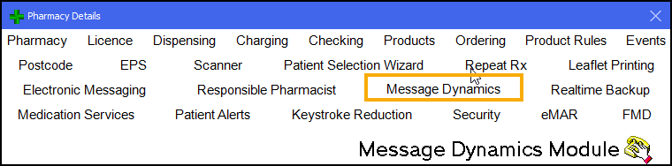 The Pharmacy Details screen displays. Select Message Dynamics: