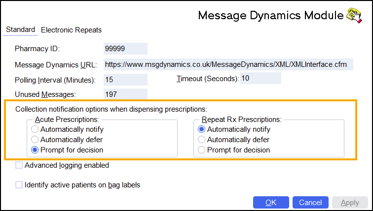 From Collection notification options when dispensing prescriptions, choose how you wish to notify Message Dynamics patients when their prescriptions are available for collection. Separate choices can be made for Acute Prescriptions and Repeat Rx Prescriptions: