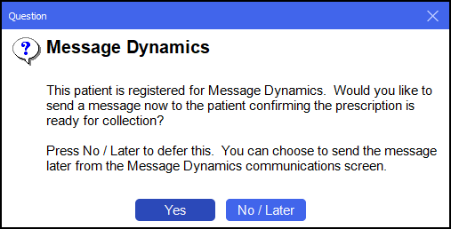 Select Yes to send a message to the patient confirming their prescription is ready for collection.