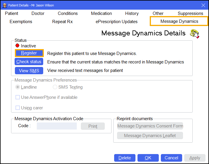 Patients must be registered for Message Dynamics and have signed a consent form before you can use it to manage a patient's prescriptions.