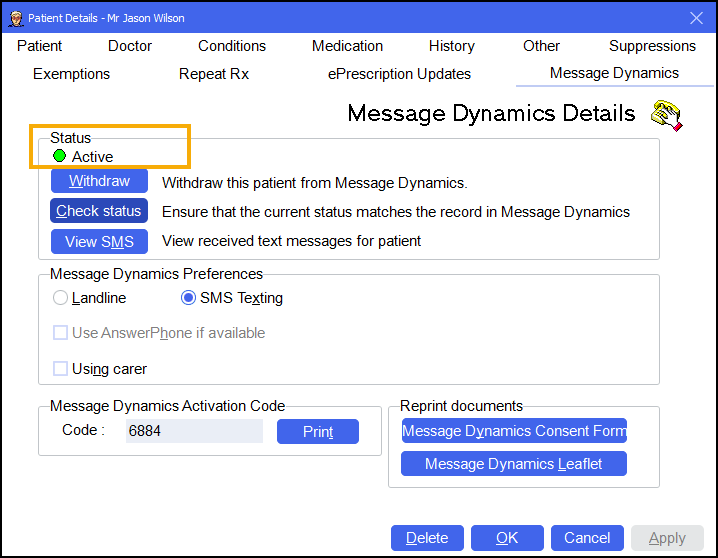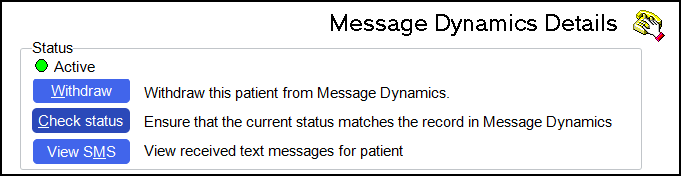 Check status - Select to check the patient's Message Dynamics status against what is recorded in the Message Dynamics system.