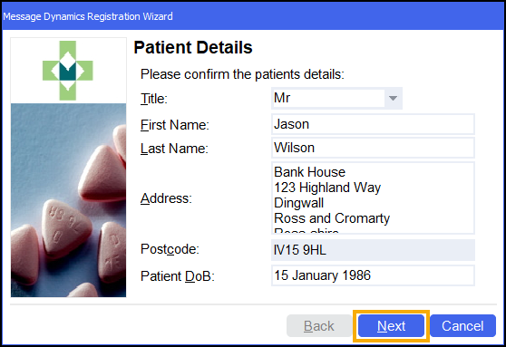 - The Message Dynamics Registration Wizard - Patient Details screen displays: