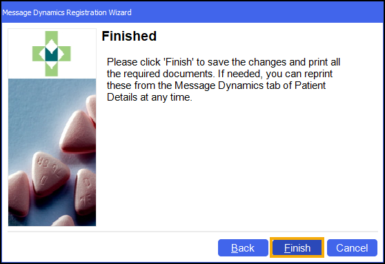 The Message Dynamics Registration Wizard - Finished screen displays, select Finish