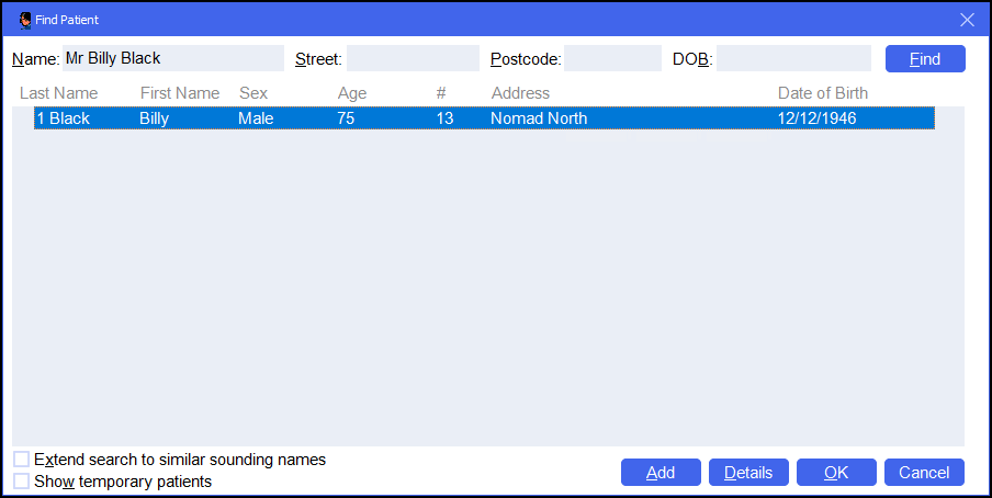 - A list of all available patients that match your criteria displays. Highlight the patient required and select OK: