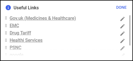 The Useful Links tile on your Pharmacy Manager dashboard allows you quick and seamless access to websites you, as a pharmacy, use or might find useful.