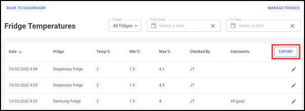 You can easily run and export a fridge temperature report, helping you obtain an accurate reading of the temperature your fridge(s) are being kelp at.