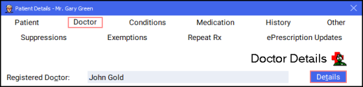 The Patient Details screen displays. Select the Doctor tab and select Details