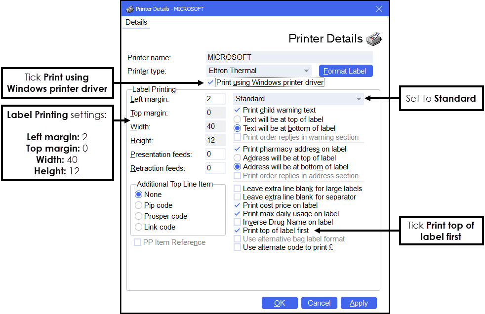 Please see below for the recommended Printer Details settings in Pharmacy Manager: