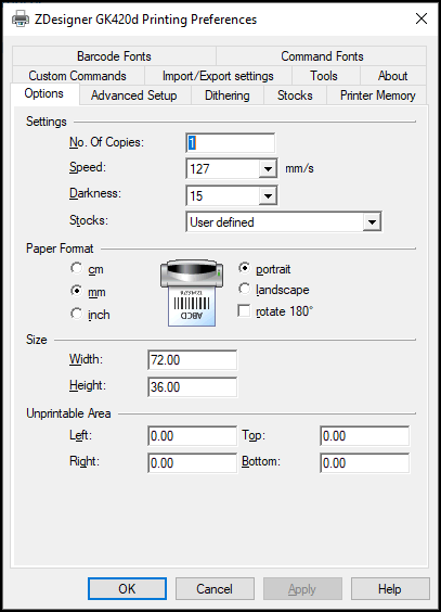 Please see below for the recommended label settings for the ZDesigner GK420d printer: