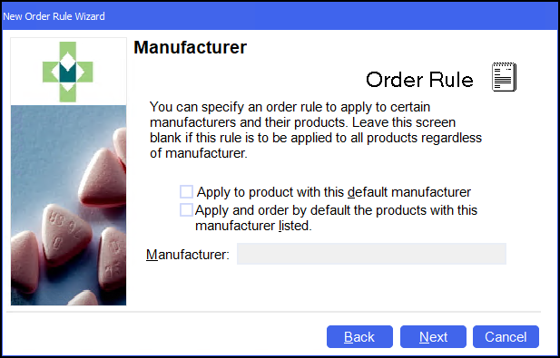 Manufacturer - Enter a manufacturer if you wish to apply the order rule to a specific manufacturer or leave blank if this rule is to be applied regardless of manufacturer.