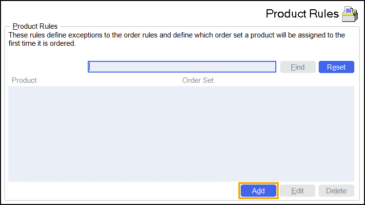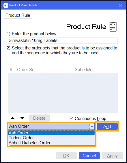 The Product Rule Details screen displays. Choose the order set from the dropdown list. Select Add