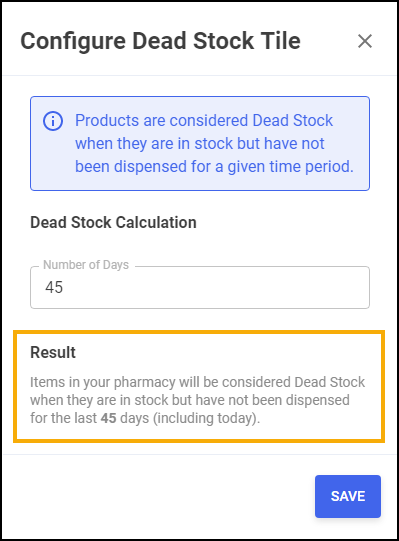 This displays a real-time count of the number of products within the pharmacy that are deemed dead stock. This is calculated based on items that are in stock within the pharmacy but have not been dispensed within a set number of days: