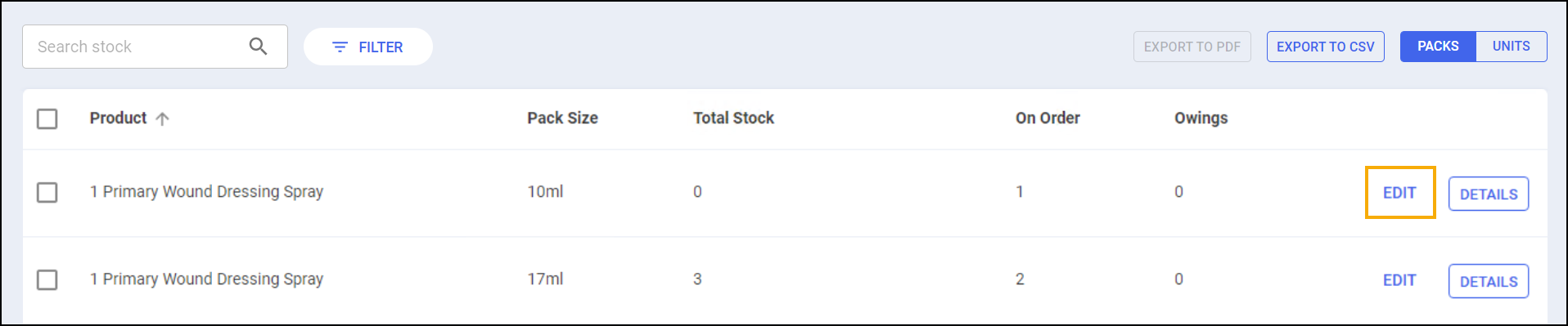 The editable stock items display with a blue box surrounding it. Enter the correct stock number and select Save
