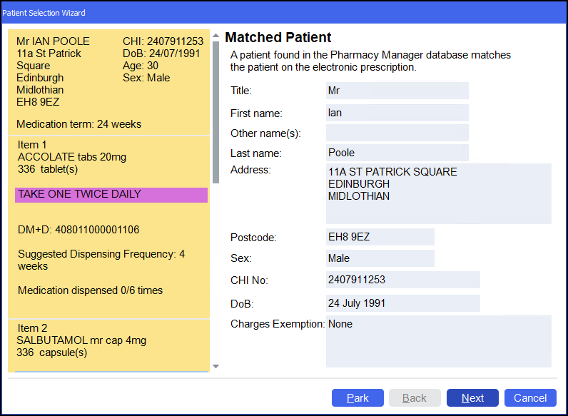 The Matched Patient screen displays. Confirm the patient's identity and select Next