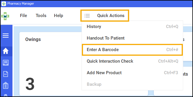 Scan the barcode on the Serial (MCR) Prescription, or select Quick Actions - Enter A Barcode, and enter the UPN number from the Serial (MCR) Prescription: