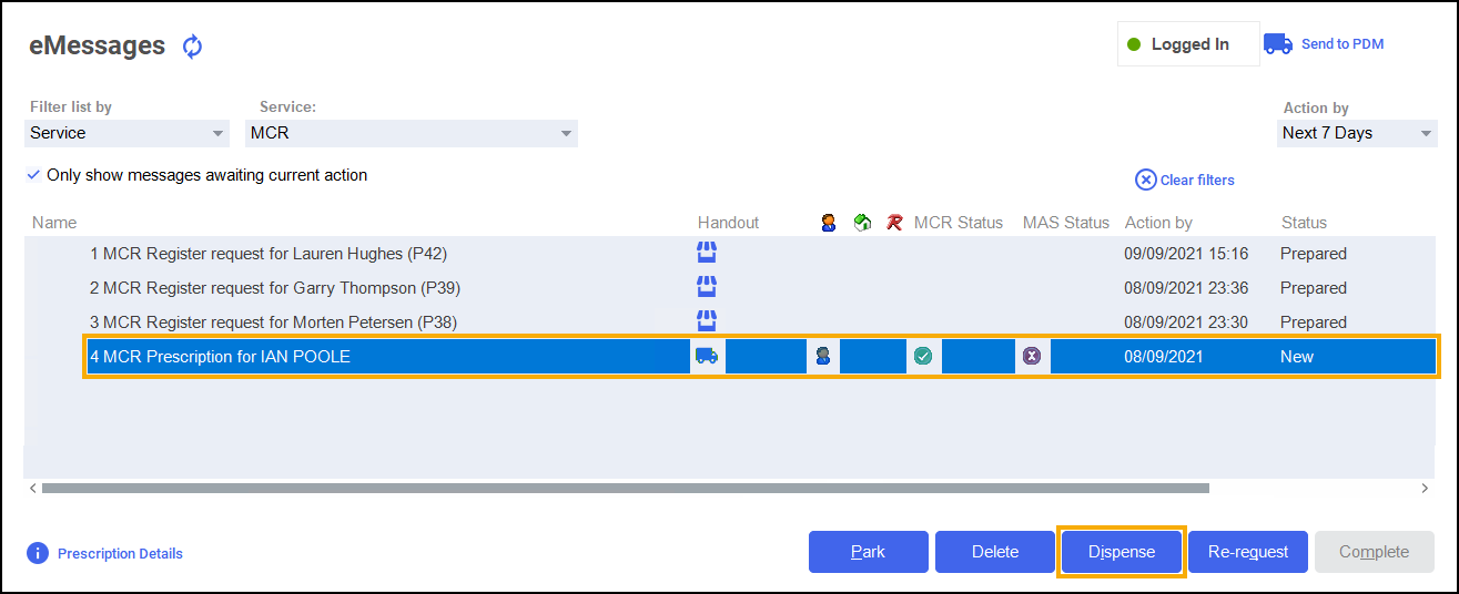 Training Tip - If you are unsure when you are going to dispense the first iteration of the prescription you can choose to Park the prescription. The prescription status will change from New to Parked and will no longer display as a New Prescription. -