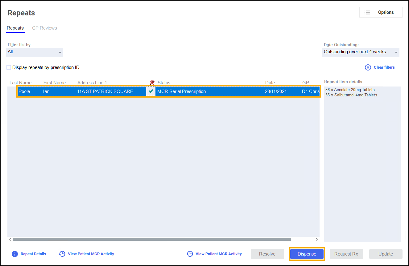 screen. When the prescription is due to be dispensed, it displays within the Repeats screen.