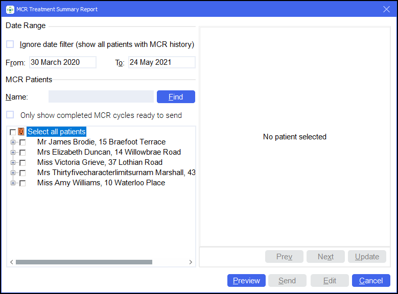 - If you want to view only patient(s) with completed MCRs place a tick next to Only show completed MCR cycles ready to send.