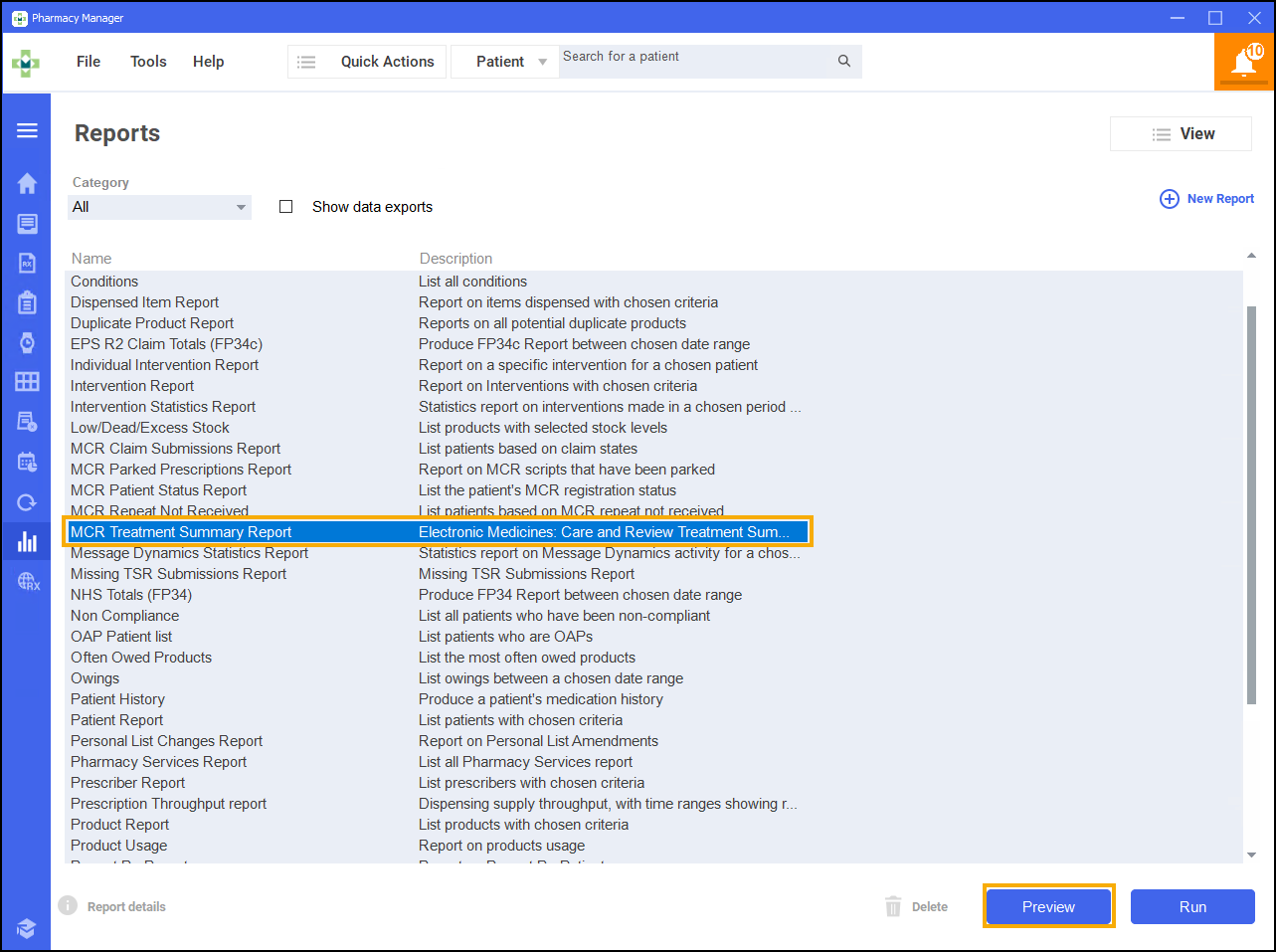 From the list of available reports, select MCR Treatment Summary Report and select Preview