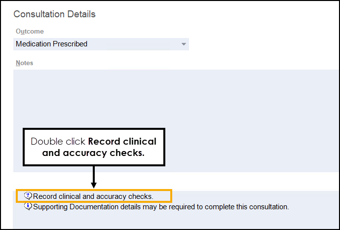 From the Consultation Details section of the UCF Supply, select Record clinical and accuracy checks.