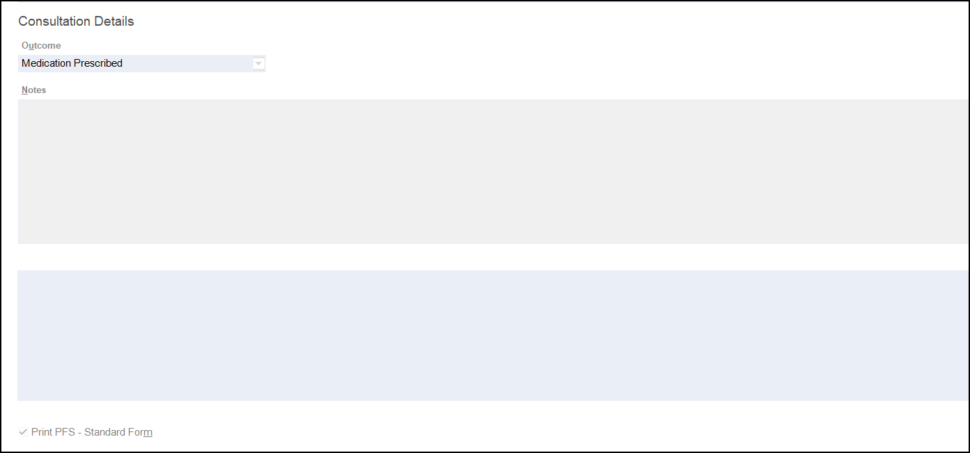 function is correct. Amend if required.Note - The Print PFS - Standard Form function is set at a system wide level. You can over-ride it on a case-by-case basis by enabling or disabling it as required. This will not affect your system wide settings. See Configuring Pharmacy First Scotland - Standard (MAS) Form Printing for more details. - From Consultation Details, complete as required: