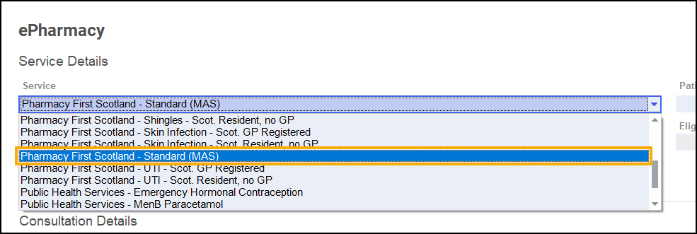 From Service, select Pharmacy First Scotland - Standard (MAS):