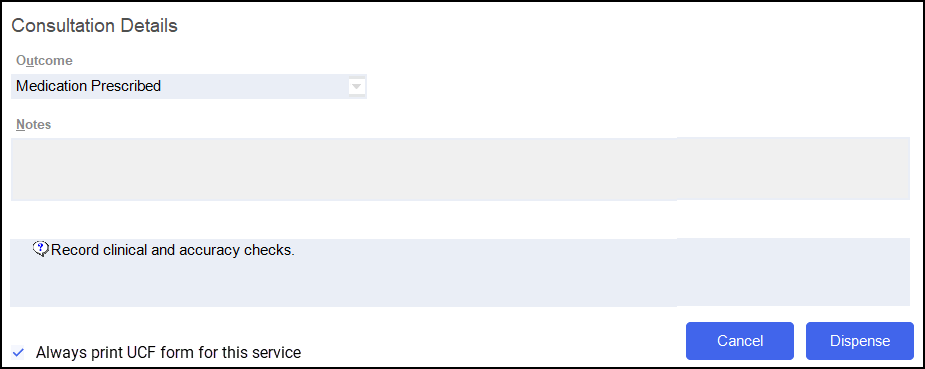 to dispense medications as required.Note - If there are any partially completed prescriptions on the Dispensary screen you cannot complete a consultation.The Dispensary