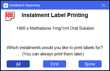 to complete the dispense. - The Instalment Label Printing screen displays, select from: