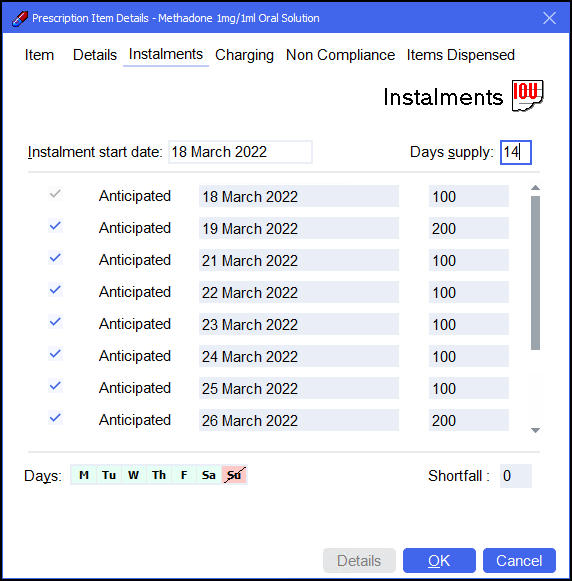 to confirm the instalment schedule.Note - If you have any quantity remaining, OK is inactive and the quantity missing displays in Shortfall. You must check the dosages and amend as needed.Training Tip - Should you need to edit the instalment schedule prior to dispensing you can select Instalment Schedule from the Dispensary screen. -