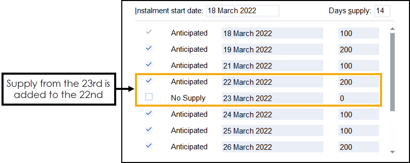- Pharmacy Manager automatically calculates the date each instalment should be given and the appropriate quantity based on the pharmacy opening days: