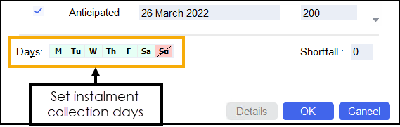 Note - Calculations are based on the pharmacy's opening hours set in Tools - System Settings - Pharmacy Details - Pharmacy - Opening Times. In the above example the pharmacy does not open on a Sunday so Pharmacy Manager schedules two instalments on a Saturday.Check the instalment schedule, if your pharmacy closes on additional days or the patient cannot attend on a certain day each week, go to the Days option and select the relevant day. The day selected displays in red with a line through it and the instalment schedule updates accordingly: