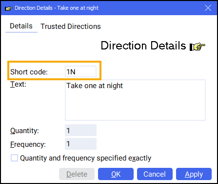 . The Direction Details screen displays. - Type in a Short code for the direction, for example, 1N for take one at night: