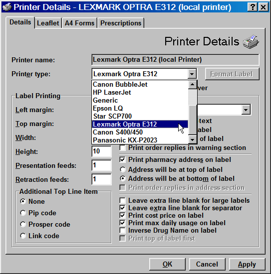 Menu > Tools > Printer configuration > Pharmacy Manager