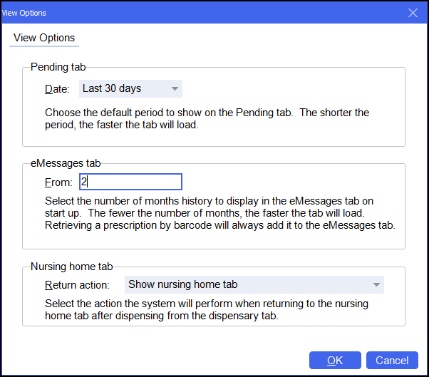 eMessages tab - Select the number of months history to display in the eMessages screen on start up. The fewer the number of months, the faster the tab will load. Retrieving a prescription by barcode will always add it to the eMessages screen.