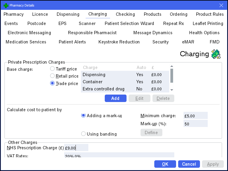 The Charging tab displays the default charges to apply to both NHS and Private Prescriptions.