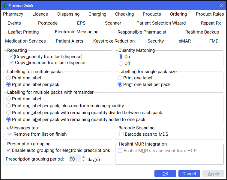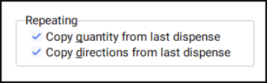 - Copy quantity from last dispense - Select to copy the quantity from the last dispense when dispensing repeat medication.