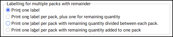 - Print one label per pack with remaining quantity added to one pack - Select to produces evenly calculated quantities but append all the remainder to one pack. For example an item packed in 28s with a dispensed quantity of 90 would print two labels of 28 and one label of 34, for example, 28 plus the remainder.