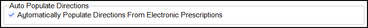 Auto Populate Directions - If ticked, when dispensing an electronic prescription the Directions field (if blank) will automatically populate on Dispensary screen with the directions directly from the electronic prescription: