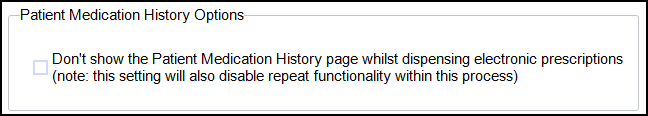 Tick Patient Medication History Options to prevent the Patient Medication History screen from appearing every time you dispense an electronic prescription. Remove the tick if you prefer not to use this feature.