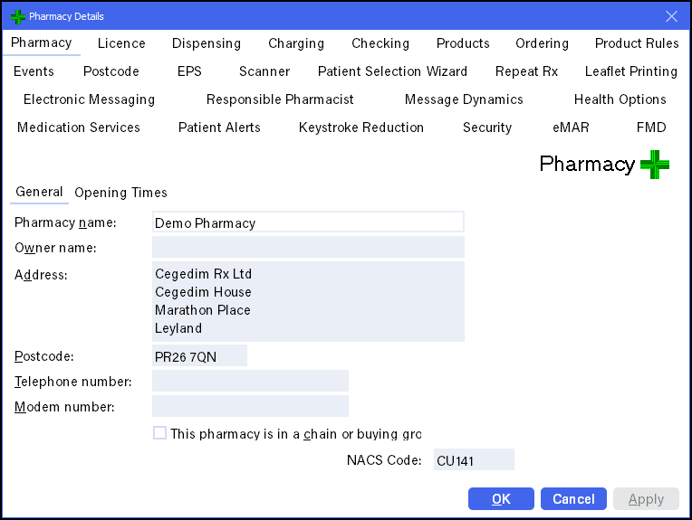 - This pharmacy is in a chain or buying group - Only appears if your pharmacy is part of a group that uses the Cegedim Branch Manager system, tick if appropriate.