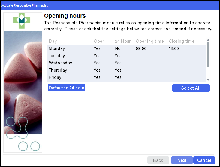 - Select Set and the display updates.Note - Opening hours can be updated from the Pharmacy tab, see Pharmacy Details - Pharmacy.